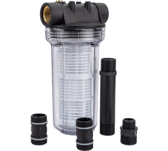 За счет прозрачного корпуса можно следить за чистотой фильтра и вовремя промыть его. Корпус легко разбирается. В комплекте идут резьбовые ниппели: 1/1" - 2 шт. и 1/3/4" - 1 шт., удлинительная насадка 1/1'' и моющийся сетчатый фильтр.